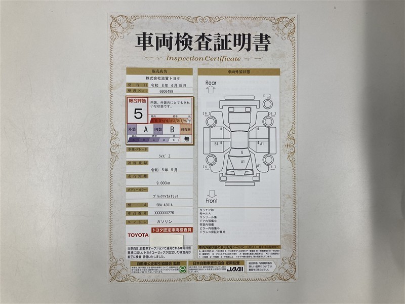 上記と同様の評価点・状態表を「車両検査証明書」として店舗の展示車両に搭載しております。