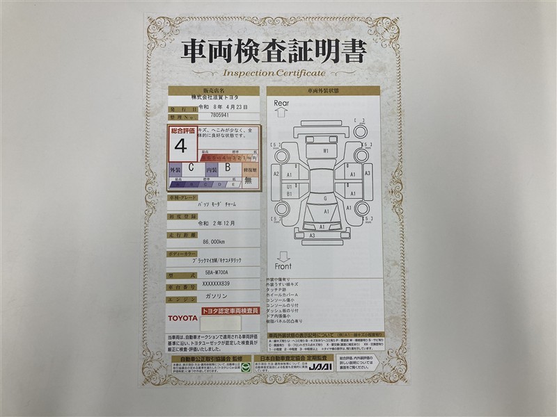 上記と同様の評価点・状態表を「車両検査証明書」として店舗の展示車両に搭載しております。