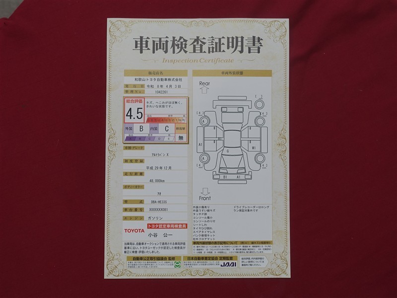 上記と同様の評価点・状態表を「車両検査証明書」として店舗の展示車両に搭載しております。