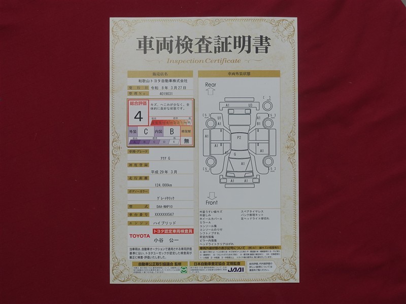 上記と同様の評価点・状態表を「車両検査証明書」として店舗の展示車両に搭載しております。