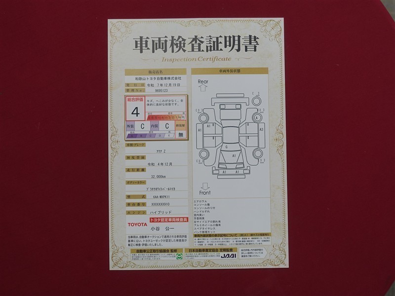 上記と同様の評価点・状態表を「車両検査証明書」として店舗の展示車両に搭載しております。