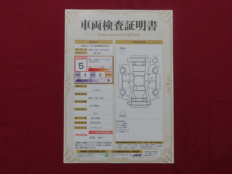 上記と同様の評価点・状態表を「車両検査証明書」として店舗の展示車両に搭載しております。