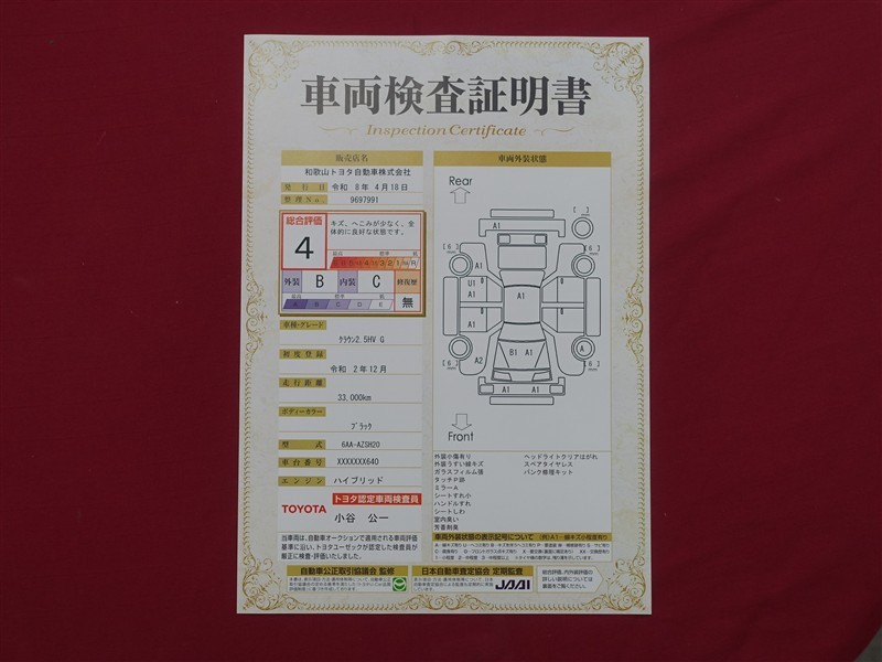 上記と同様の評価点・状態表を「車両検査証明書」として店舗の展示車両に搭載しております。