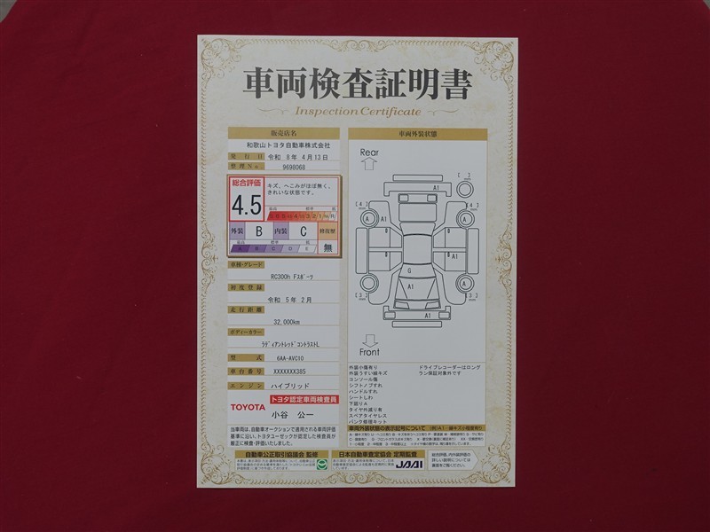 上記と同様の評価点・状態表を「車両検査証明書」として店舗の展示車両に搭載しております。