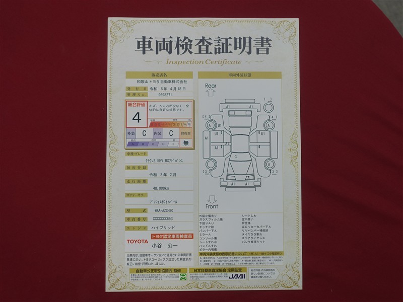 上記と同様の評価点・状態表を「車両検査証明書」として店舗の展示車両に搭載しております。