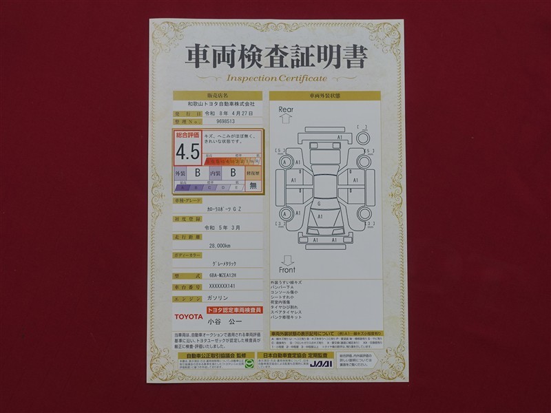 上記と同様の評価点・状態表を「車両検査証明書」として店舗の展示車両に搭載しております。