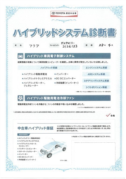 保証付:ロングラン保証1年<走行距離無制限> +ハイブリッド保証<保証期間は初度登録年月から10年目まで、もしくは3年間のいずれか長い方。但し走行距離20万キロまで>