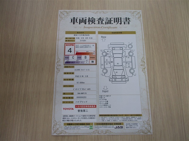 上記と同様の評価点・状態表を「車両検査証明書」として店舗の展示車両に搭載しております。