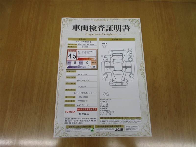 上記と同様の評価点・状態表を「車両検査証明書」として店舗の展示車両に搭載しております。