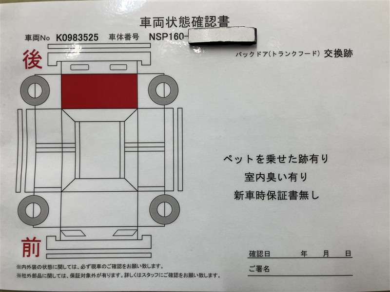 上記と同様の評価点・状態表を「車両検査証明書」として店舗の展示車両に搭載しております。