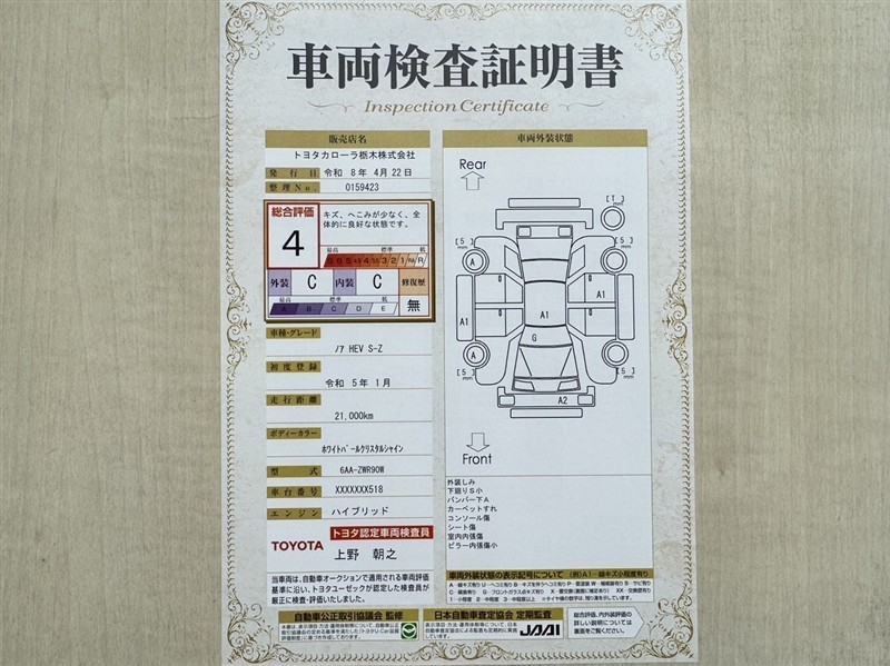 上記と同様の評価点・状態表を「車両検査証明書」として店舗の展示車両に搭載しております。