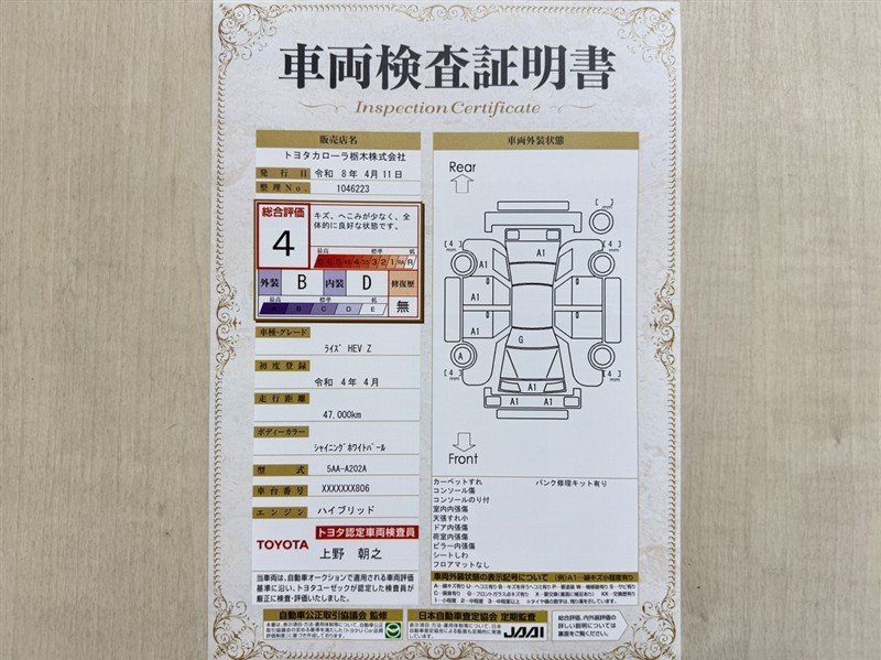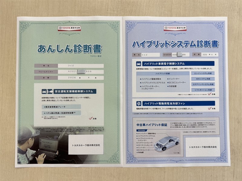 上記と同様の評価点・状態表を「車両検査証明書」として店舗の展示車両に搭載しております。