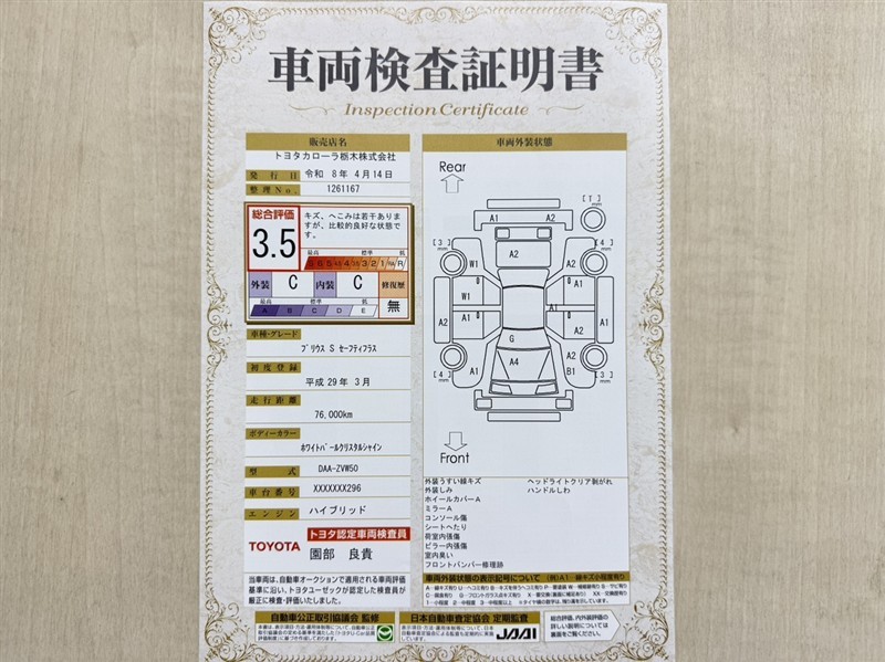 上記と同様の評価点・状態表を「車両検査証明書」として店舗の展示車両に搭載しております。