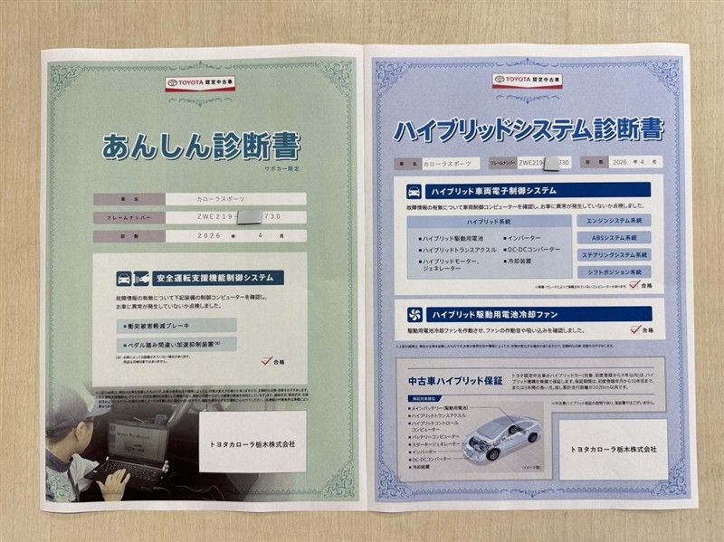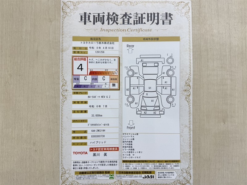 上記と同様の評価点・状態表を「車両検査証明書」として店舗の展示車両に搭載しております。