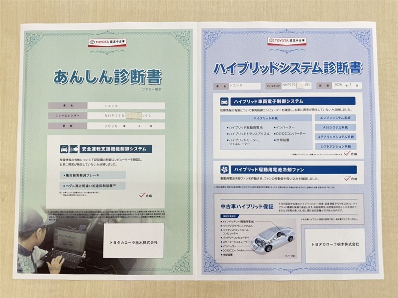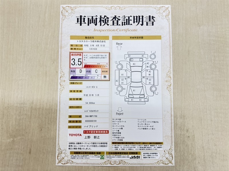 上記と同様の評価点・状態表を「車両検査証明書」として店舗の展示車両に搭載しております。