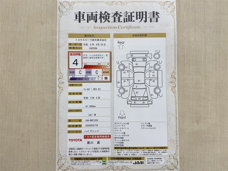 上記と同様の評価点・状態表を「車両検査証明書」として店舗の展示車両に搭載しております。