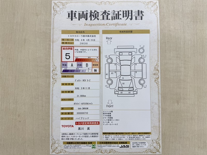 上記と同様の評価点・状態表を「車両検査証明書」として店舗の展示車両に搭載しております。