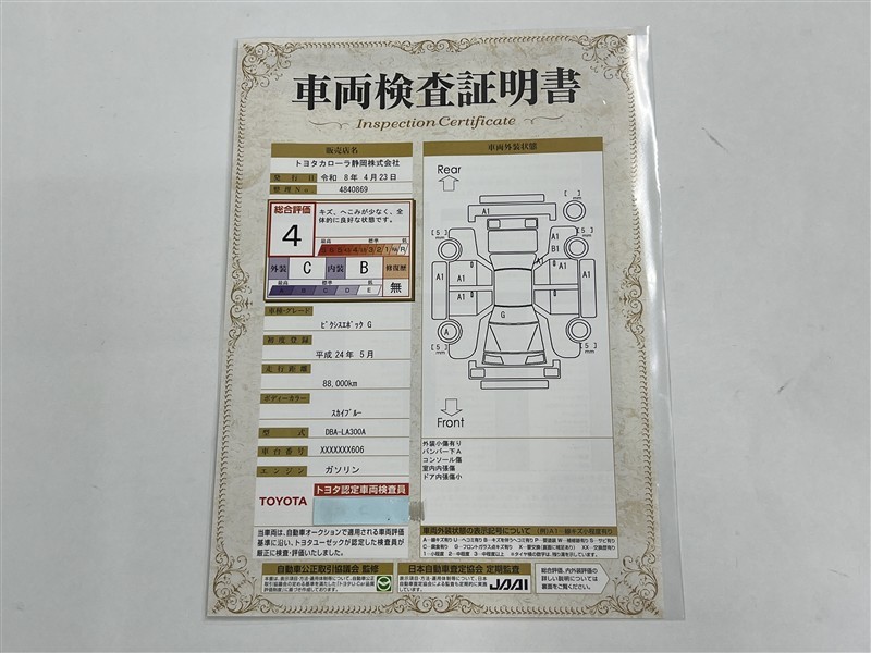 上記と同様の評価点・状態表を「車両検査証明書」として店舗の展示車両に搭載しております。