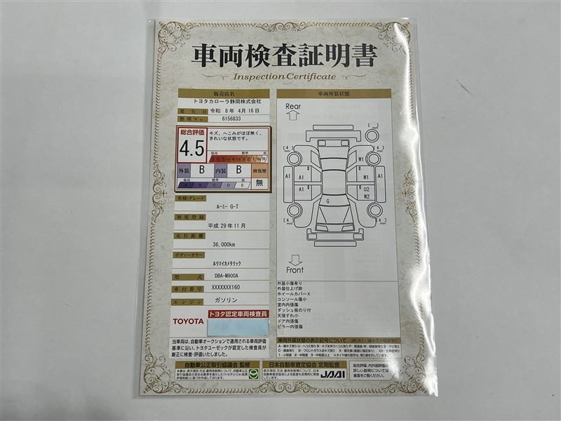 上記と同様の評価点・状態表を「車両検査証明書」として店舗の展示車両に搭載しております。
