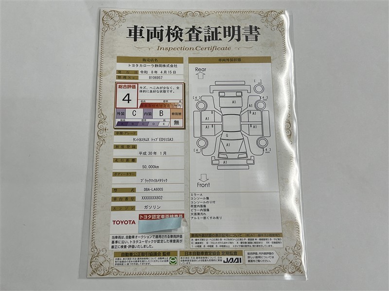 上記と同様の評価点・状態表を「車両検査証明書」として店舗の展示車両に搭載しております。