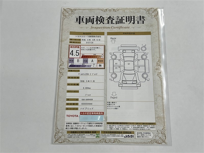 上記と同様の評価点・状態表を「車両検査証明書」として店舗の展示車両に搭載しております。