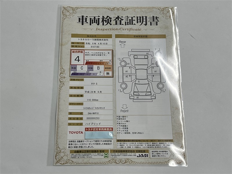 上記と同様の評価点・状態表を「車両検査証明書」として店舗の展示車両に搭載しております。