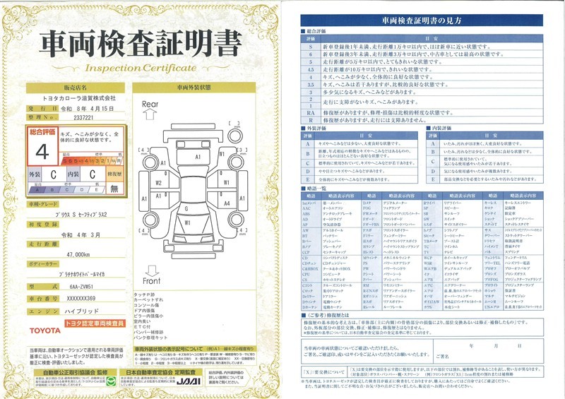 上記と同様の評価点・状態表を「車両検査証明書」として店舗の展示車両に搭載しております。