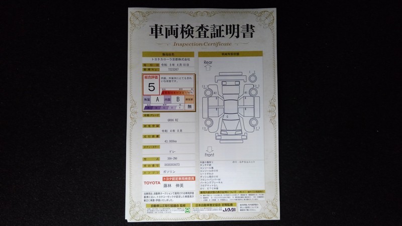 上記と同様の評価点・状態表を「車両検査証明書」として店舗の展示車両に搭載しております。