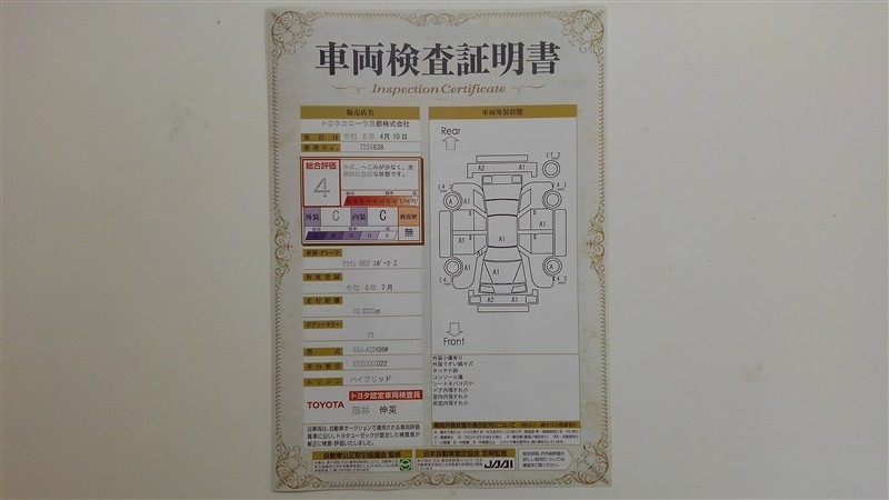 上記と同様の評価点・状態表を「車両検査証明書」として店舗の展示車両に搭載しております。