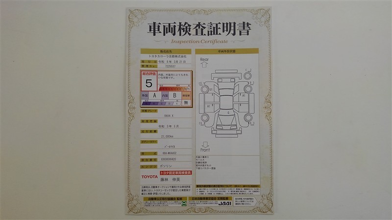 上記と同様の評価点・状態表を「車両検査証明書」として店舗の展示車両に搭載しております。
