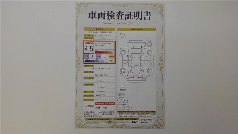 上記と同様の評価点・状態表を「車両検査証明書」として店舗の展示車両に搭載しております。