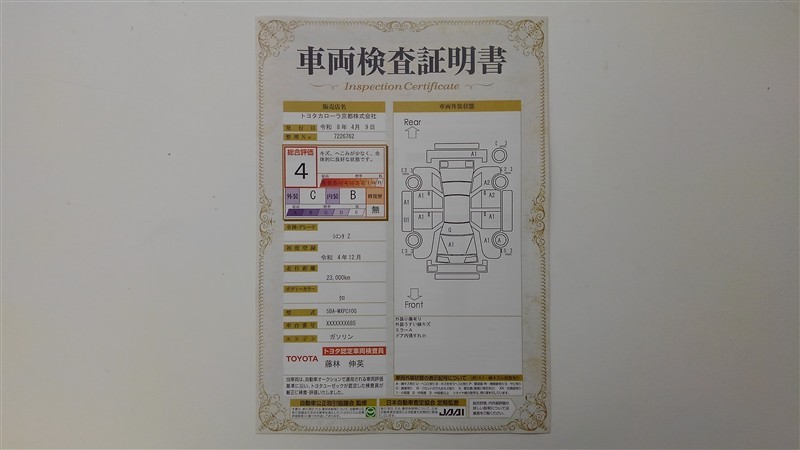 上記と同様の評価点・状態表を「車両検査証明書」として店舗の展示車両に搭載しております。