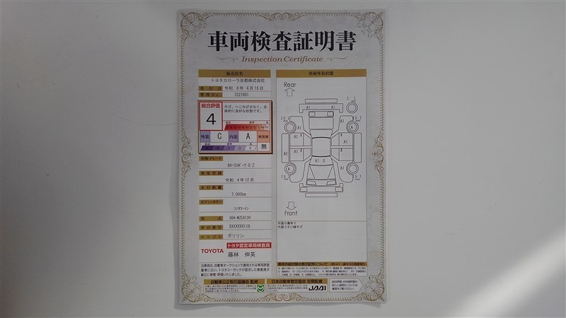 上記と同様の評価点・状態表を「車両検査証明書」として店舗の展示車両に搭載しております。