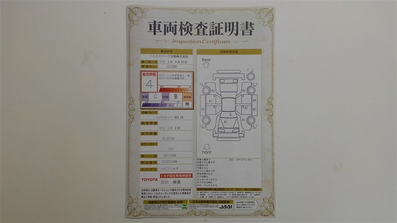 上記と同様の評価点・状態表を「車両検査証明書」として店舗の展示車両に搭載しております。