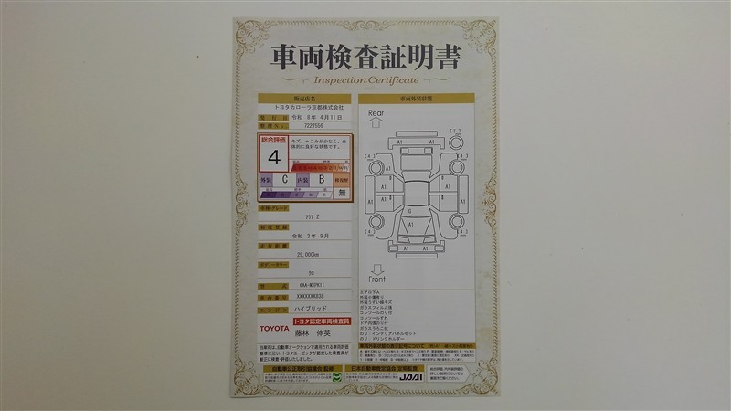 上記と同様の評価点・状態表を「車両検査証明書」として店舗の展示車両に搭載しております。