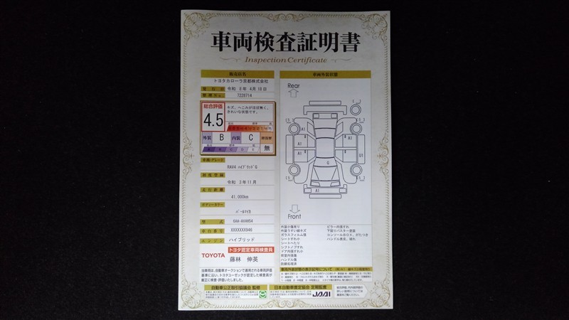 上記と同様の評価点・状態表を「車両検査証明書」として店舗の展示車両に搭載しております。