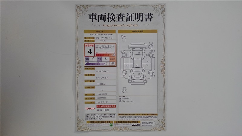 上記と同様の評価点・状態表を「車両検査証明書」として店舗の展示車両に搭載しております。