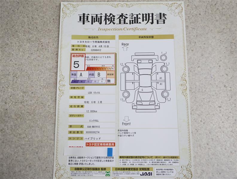 上記と同様の評価点・状態表を「車両検査証明書」として店舗の展示車両に搭載しております。