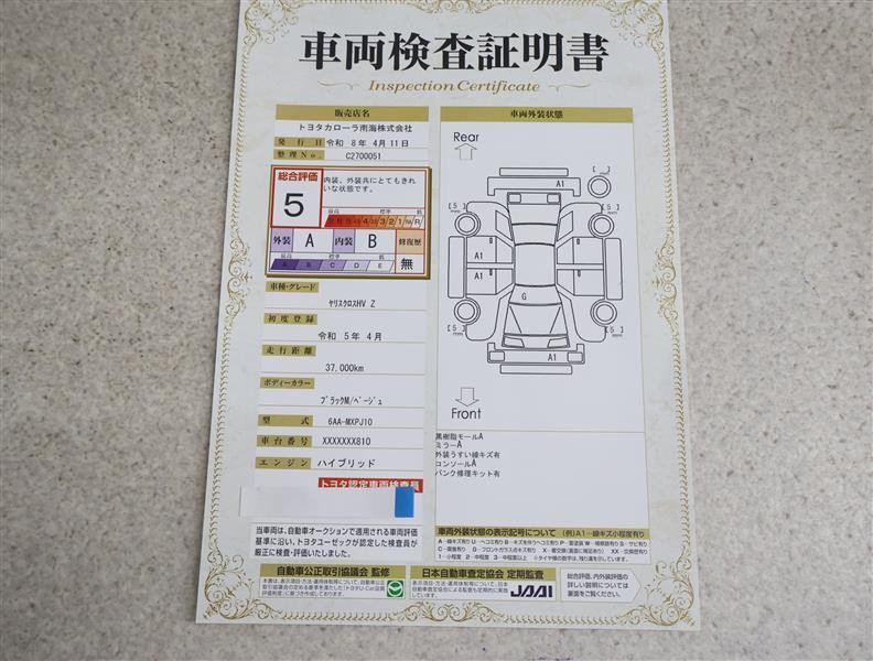 上記と同様の評価点・状態表を「車両検査証明書」として店舗の展示車両に搭載しております。