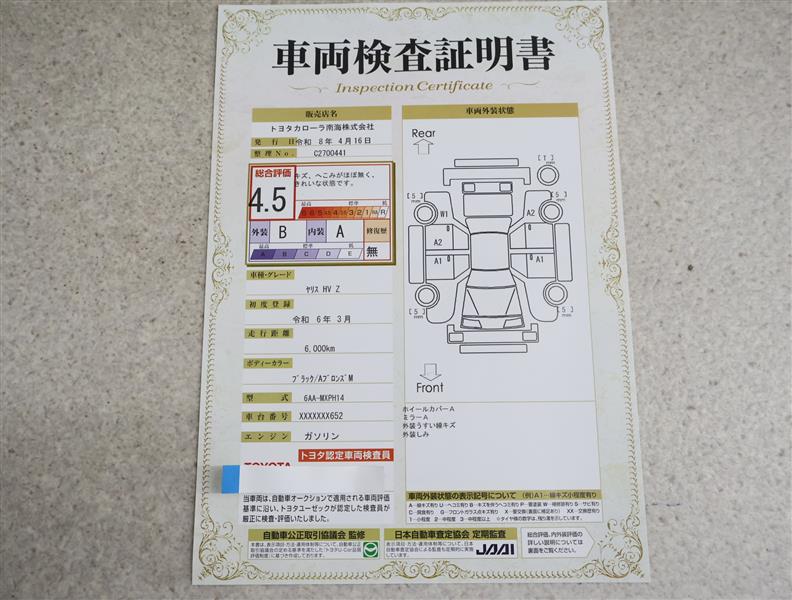 上記と同様の評価点・状態表を「車両検査証明書」として店舗の展示車両に搭載しております。