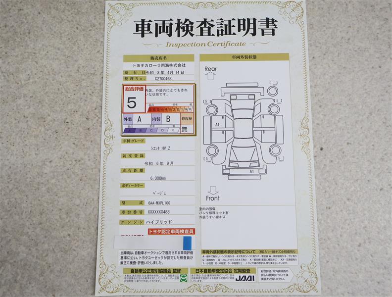 上記と同様の評価点・状態表を「車両検査証明書」として店舗の展示車両に搭載しております。
