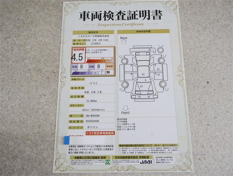 上記と同様の評価点・状態表を「車両検査証明書」として店舗の展示車両に搭載しております。