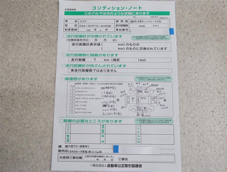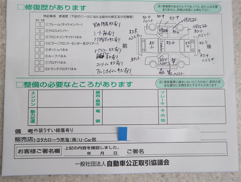 「修復歴あり」の場合、修復部位の詳細につきましては、販売店へお問合せください。