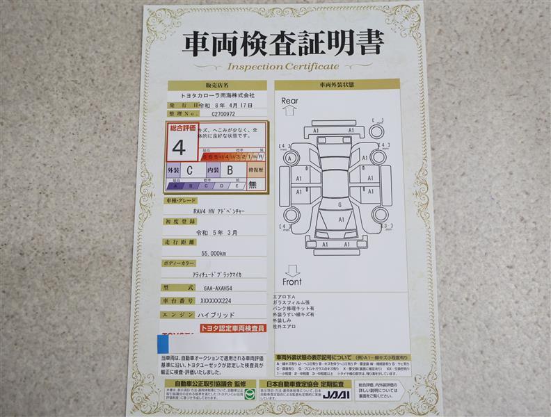 上記と同様の評価点・状態表を「車両検査証明書」として店舗の展示車両に搭載しております。