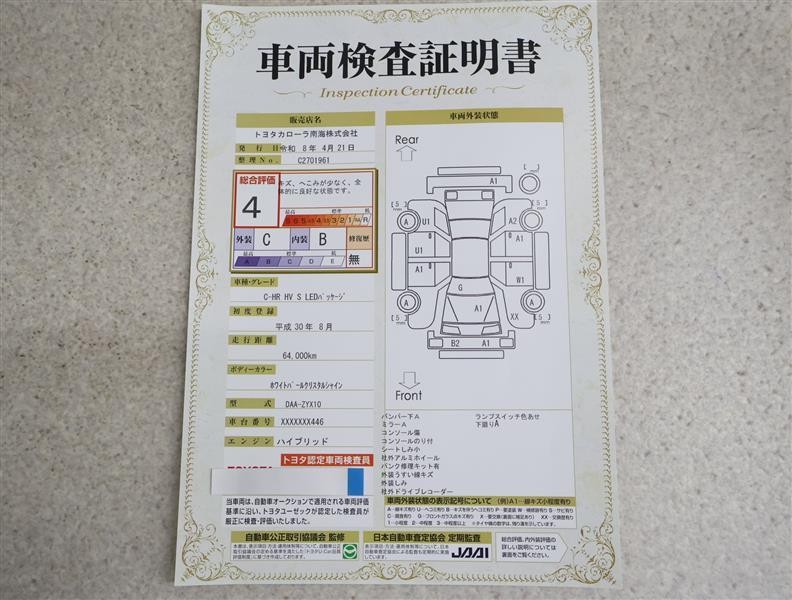 上記と同様の評価点・状態表を「車両検査証明書」として店舗の展示車両に搭載しております。