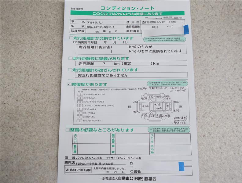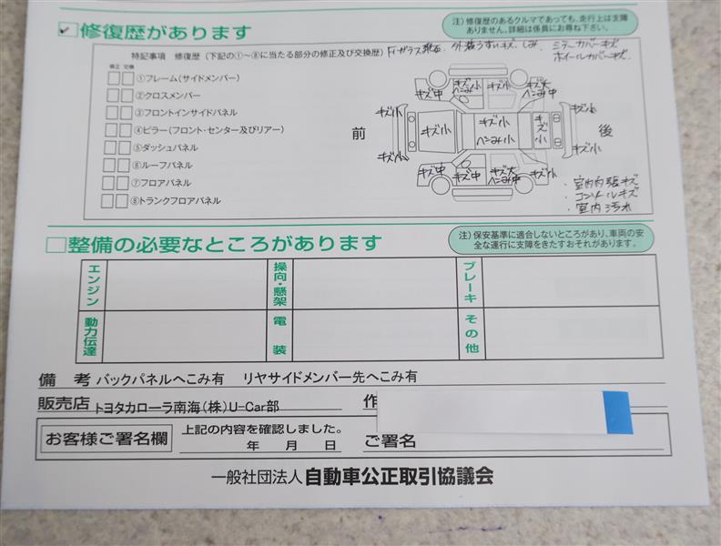 「修復歴あり」の場合、修復部位の詳細につきましては、販売店へお問合せください。
