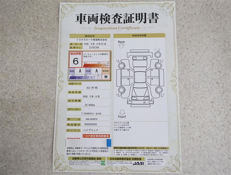 上記と同様の評価点・状態表を「車両検査証明書」として店舗の展示車両に搭載しております。