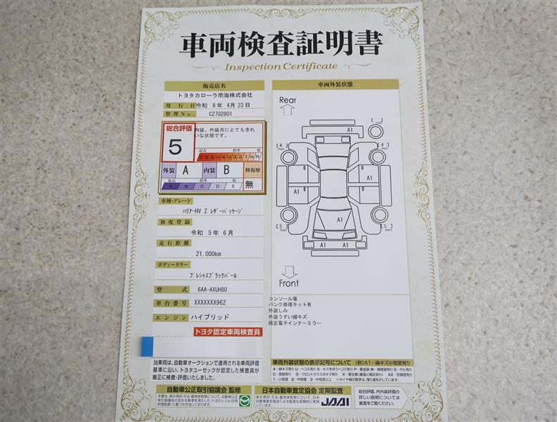上記と同様の評価点・状態表を「車両検査証明書」として店舗の展示車両に搭載しております。