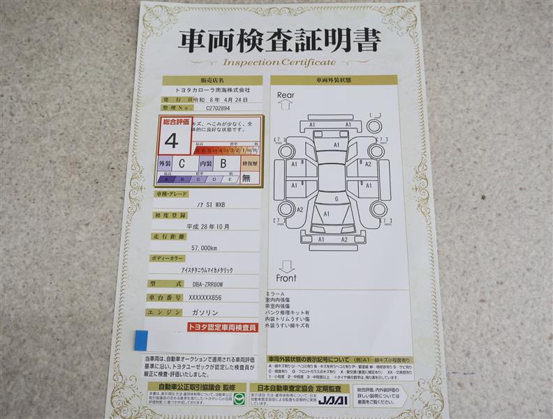 上記と同様の評価点・状態表を「車両検査証明書」として店舗の展示車両に搭載しております。