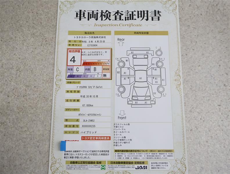 上記と同様の評価点・状態表を「車両検査証明書」として店舗の展示車両に搭載しております。